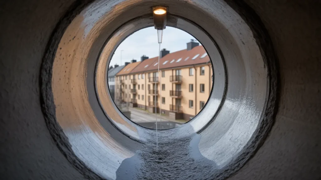 När genomspolningarna var klara filmade vi åter alla stammar för att verifiera fria flöden och kontrollera skarvar, gren, fall och eventuella sprickindikationer. Vi spolade även servisledningen ut till förbindelsepunkten och följde upp med provspolning i flera lägenheter samtidigt och i tvättstugan, utan återfyllnad i golvbrunnar. Samtliga vattenlås fylldes och luktprov gjordes i trapphus och källare. Egenkontrollen dokumenterades med checklista, foton och filmsekvenser, inklusive trycklogg och noteringar om åtgärdade rensluckor. Du fick en rapport med rekommendation om intervall för nästa underhållsspolning samt observationer av två korrosionsfickor som bör följas upp vid kommande inspektion.
